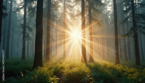 Sunlight Streaming Through Trees in Serene Forest at Sunrise