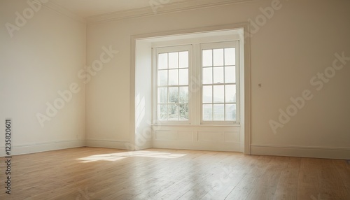 Sunlight Streams In: A clean, minimalist interior with a large window bathing the hardwood floor in warm sunlight, inviting natural light and a sense of tranquility into the space.