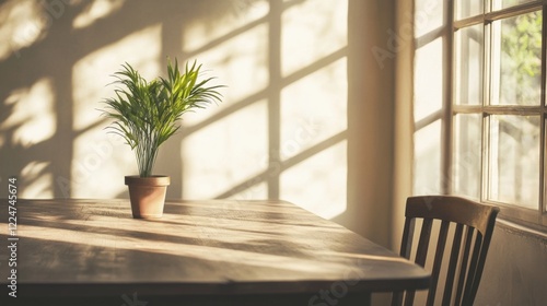Sunlight streams through window onto wooden table with potted plant and chair.