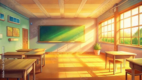 classroom, school, desk, chair, table, window, light, sun, sunlight, sunshine, ray, ray, green, blackboard, wall, door, room, interior, wooden, floor, tile, plant, pot, shadow, bright, empty, clean, morning, afternoon, day, building, education, learning, study