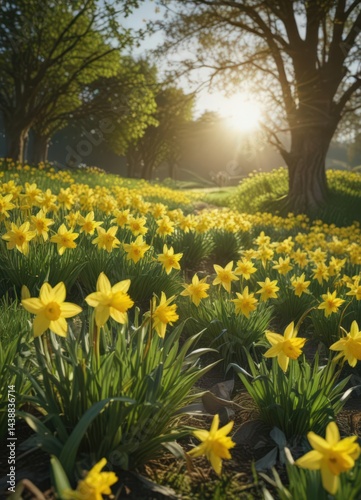 Sunlit daffodils burst forth in a vibrant yellow against a lush green field , bloom, macro, day