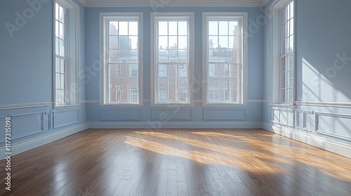 Sunlit empty blue room with hardwood floor, large windows, and city view