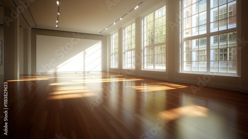 Sunlit Empty Gallery Space: A Modern Architectural Interior with Hardwood Floor and Large Windows
