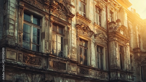 building, architecture, old, antique, vintage, city, urban, facades, window, stone, wall, sunset, sun, light, gold, detail, ornate, decor, design, historic, historical, exterior, structure, classic, elegant, decay, worn, aged, texture, surface, pattern, brown, yellow, grey, europa, travel, place, scene, view, summer, day, aesthetic, retro, grime, weathering, damage, crumbling, ruin, historical building