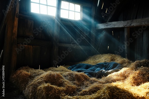 hay, barn, wood, beam, sunbeam, light, dust, shadow, rustic, old, aged, weathered, texture, fabric, blanket, bedding, straw, gold, dark, interior, window, pane, rural, countryside, structure, building, atmosphere, peaceful, serene