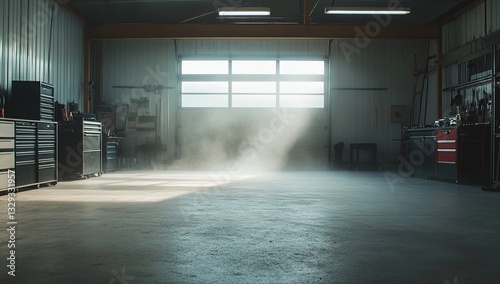 garage, industrial, sunlit, dust, light, beam, window, tool, storage, unit, workshop, warehouse, building, interior, space, empty, floor, concrete, sunlight, ray, atmosphere, industrial building, roomy, airy, clean, organised, metal, cabinet, equipment, machinery, work, area, repair, maintenance, manufacturing, production, factory, construction, engineering, design, architecture, scene, setting, photo, image, visual, aesthetic