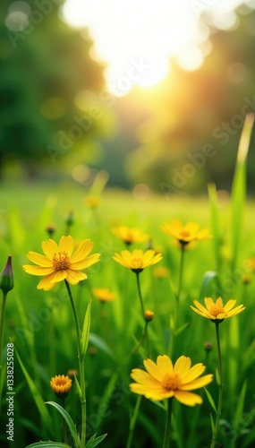 Sunlit meadow wildflowers yellow flowers green grass, green meadow, landscape photography,