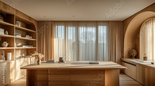 office, home, wood, desk, shelf, minimal, sunlight, window, arch, interior, design, modern, calm, serene, peaceful, tranquil, roomy, bright, light, airy, elegant, sophisticated, luxury, style, contemporary, architecture, room, workspace, furniture, decor, aesthetic, simple, clean, natural, warm, cosy, comfortable, inviting, relaxing, quiet, study, bookshelf, curtain