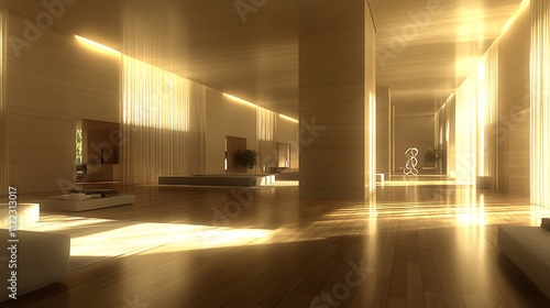 interior, design, architecture, modern, minimalist, contemporary, sunlight, sunbeam, hardwood, floor, ceiling, high, sheer, curtain, room, space, hall, lobby, lounge, living, elegant, luxury, calm, peaceful, serene, tranquil, roomy, bright, light, warm, gold, yellow, wooden, wall, column, furniture, sofa, plant, sculpture, shine, ambience, style, home, house, building, apartment