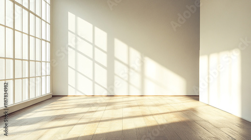 Sunlit Minimalist Room with Warm Wooden Floor. A spacious, sunlit room featuring a warm wooden floor and soft shadows from large windows, perfect for photography or interior design inspiration.