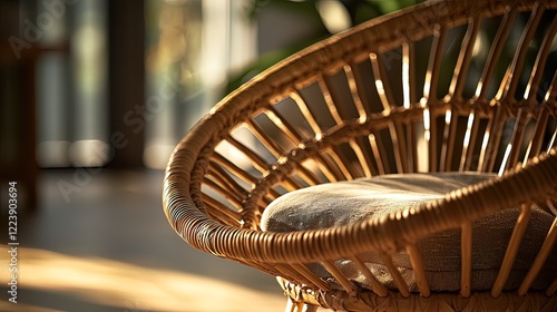chair, rattan, wicker, sunlit, sunlight, cushion, grey, indoor, furniture, home, decor, design, cosy, comfort, relaxing, natural, light, warm, texture, threaded, pattern, style, room, interior, house, apartment, living, space, seating, bohemian, vintage, hand-made, craft, elegant, modern, simple, comfortable, stylish, aesthetic, beautiful, brown, organic