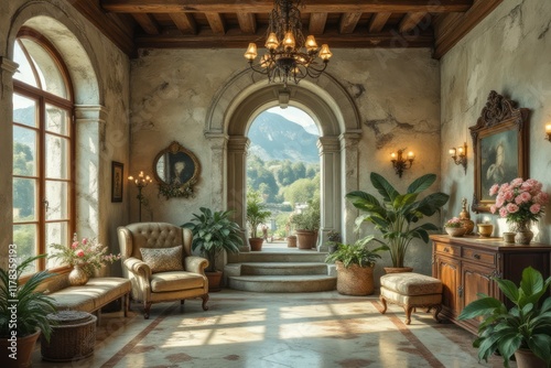 room, vintage, sunlit, mountain, view, plant, antique, furniture, armchair, chair, flower, chandelier, lighting, window, archway, stone, wall, wood, floor, elegant, classic, decor, interior, design, home, house, cosy, peaceful, serene, calm, luxury, sophisticated, stylish, picture, painting, mirror, ottoman, cabinet, rustic, potted
