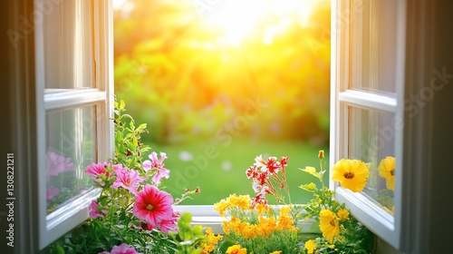 window, flower, garden, sun, spring, bloom, bright, light, flower petals, plant, nature, summer, sunrise, sunset, beauty, blossom, home, landscape, green, vibrant, colours, happiness, peaceful, calmness, serenity, fresh, growth, life, botany, floral, sunshine, day, scene, view, background, image, photo, picture, design, illustration, element, texture