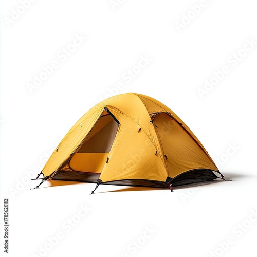 tent, camping, yellow, dome, shelter, recreation, adventure, travel, isolated, white, background, nylon, vacation, gear, equipment, wilderness, lightweight, portable, structure, overnight, weekend, escape, exploration, leisure, tour tourism, sunny, bright, fabric, material, pitched, pole, stake, ground, shadow, minimalist, simple, plain, centered, doorway, entrance, canopy, comfortable, relaxing