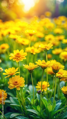 Sunny yellow flowers blooming in a vibrant flowerbed amidst lush green grass and soft earthy tones