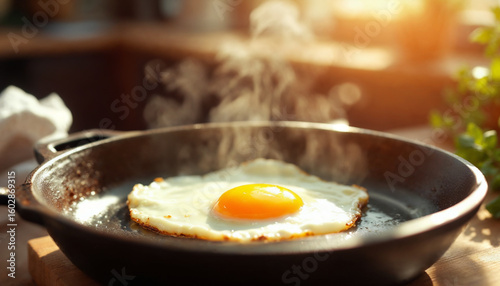 Sunny-side-up egg sizzles in cast iron skillet with warm morning light.