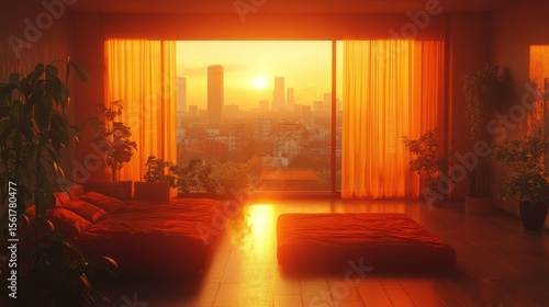 sunrise, apartment, interior, warm, sunset, hue, orange, red, sunlight, city, view, window, curtain, living, room, modern, design, zen, minimalist, comfort, cosy, calm, relaxation, peace, tranquil, bright, natural, light, roomy, floor, mat, pillow, plant, decor, home, space, geometric, warmth, ambience, soft, sharpened, aesthetic, rustic, architecture, digital