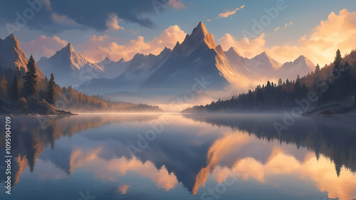 mountain, lake, landscape, sky, nature, mountain, water, fog, snow, sunset, sunrise, cloud, forest, morning, alps, hill, cloud, winter, tree, view, vale, travel, scenic, mist