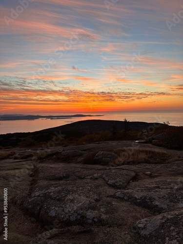 ocean, landscape, sunrise, mountain, acadia, maine, national park, rock, red, orange, water, sea, seascape, purple, yellow, blue, skyline, sky, cloud, island, island, east coast, new england, autumn, fall, sunset, nature, beach, coast, rock, travel, desert, sun, cloud, mountain, view, sand