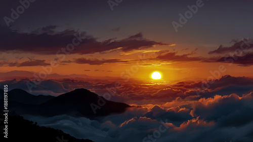 Sunrise over the mountain peak with fog and clouds, creating an epic sunrise scene. A colorful sky with sun rising behind mountains, illuminating the peaks above sea of cloud