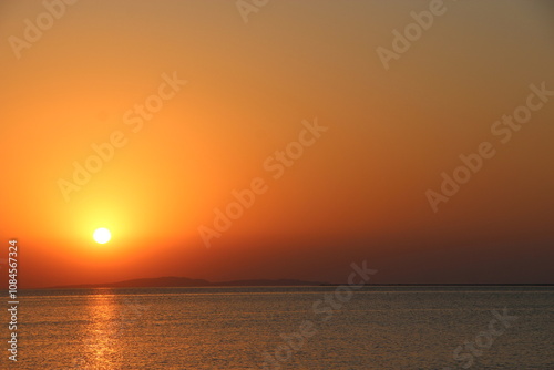 Sunrise over the sea. Sunset above ocean. Sun rising over the surface of sea
