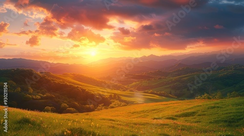 Sunset casting warm hues over lush hills (focus on, serene landscape, vibrant, Overlay, Rural valley)