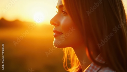 sunset, glow, woman, smiling, countryside, happiness, joy, profile, portrait, nature, evening, light, face, beauty, relaxation, calm, serene, people, young, casual attire, peaceful, warmth, emotion, content, summer, atmosphere, leisure, silhouette