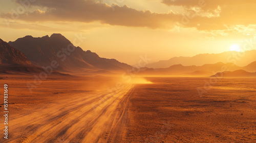 Sunset in a desert with sand dunes and mountain ranges. Useful for articles about travel, adventure, natural landscapes.