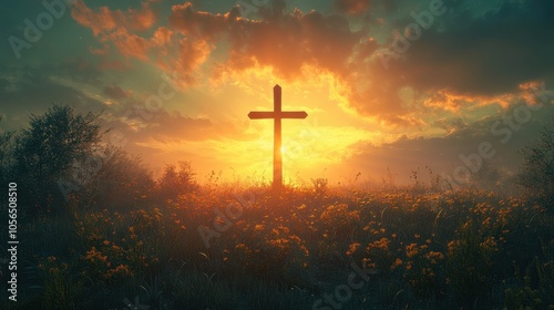 Sunset over a cross in a tranquil meadow filled with wildflowers