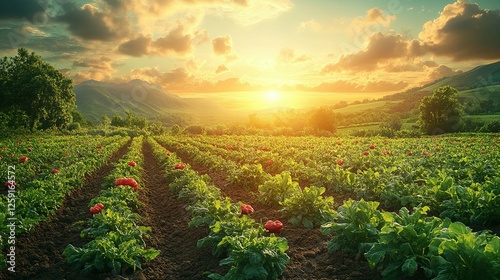 sunset, sunrise, mountain, hill, landscape, field, crop, plant, agriculture, farming, rural, scenic, nature, view, sky, cloud, gold, sun, light, ray, green, lush, vibrant, red, flower, blossom, dirtied, row, earthy, tranquil, serene, peaceful, beauty, picturesque, amazing, stunning, awesome, magnificent, breathtaking, outdoors, environment, ecology