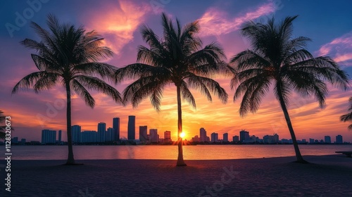 sunset, city, skyline, palm tree, beach, water, silhouette, landscape, tropical, evening, nature, vacation, travel, scenic, outdoors, colourful, horizon, relaxation, photo, summer