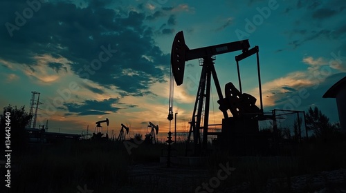 sunset, extraction, industry, environment, silhouette, cloud, landscape, machinery, crude oil, dusk, drilling, energy, nature, horizon, industrial, agriculture, sky, orange, blue, equipment, rural, activity, environmentalism, fuel, resource, creative, technology, oilfield, exploration, gloaming, dramatic, contrast, shadow, ecology, production, non-renewable, atmospheric, abandoned, urbanisation, sustainability, infrastructure