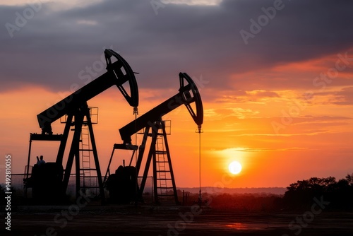 Sunset over oil pumps in a rural landscape highlighting energy production