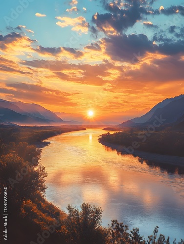 sunset, river, mountain, landscape, golden hour, nature, sky, cloud, water, scenic, vale, twilight, dusk, orange, blue, tree, sun