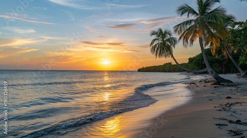 Sunset over serene Hawaii beach with golden sands, turquoise waters, and palm trees in the background, captured during a peaceful evening.