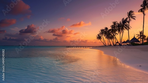 beach, sunset, tropical, palm, tree, sky, water, ocean, sand, cloud, gold, orange, pink, purple, horizon, calm, peaceful, serene, vacation, paradise, island, exotic, beautiful, nature, landscape, silhouette, breakwater, pier, shore, coast, travel, holiday, resort, relaxation, leisure