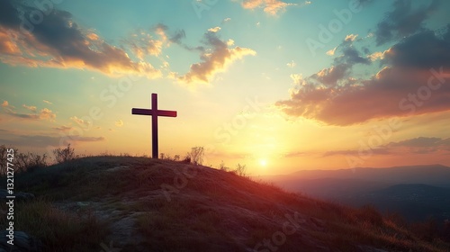Sunset Serenity: A Christian cross stands silhouetted against a breathtaking sunset sky, atop a gently rolling hill. Peaceful, spiritual, and