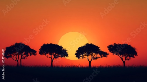 sunset, tree, silhouette, africa, savanna, orange, sky, sun, horizon, landscape, nature, evening, dusk, warm, colours, red, fiery, vibrant, tropical, wildlife, peace, calm, serene, tranquil, beautiful, scenic, picturesque, romantic, gold, illuminated, shadow, dark, branch, leaf, root, ground, grass, field, flora, art, illustration, design