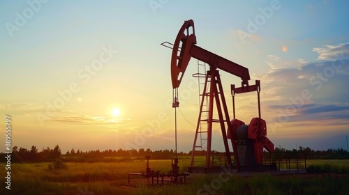 Sunset Symphony: Oil Derrick Pumping at Dusk in an Open Field with Abundant Copy Space