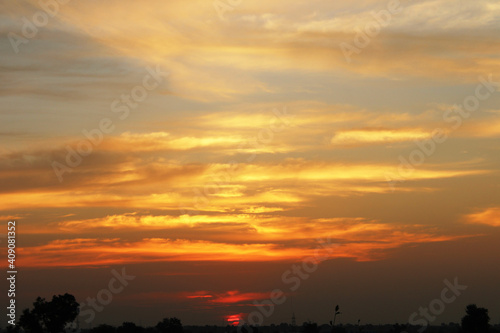 Sunset view in the village farm field.