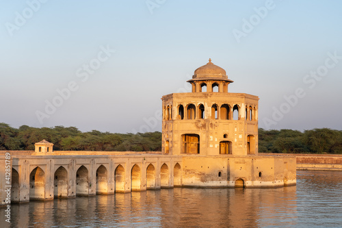 Sunset view of ancient octagonal pavilion and causeway bridge on water tank pool at mughal era Hiran Minar complex in Sheikhupura, Punjab, Pakistan
