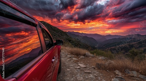 Sunset View Reflected in Car Window Along Mountain Road with Dramatic Clouds and Vibrant Colors Overlooking Scenic Landscape at Dusk