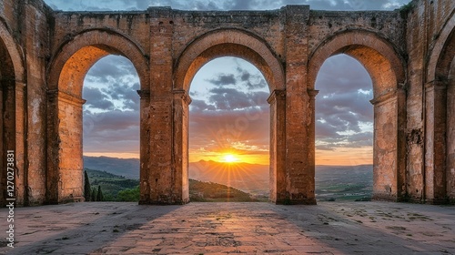 sunset, arch, landscape, ancient, stone, dusk, view, horizon, scenic, nature, beauty, architecture, evening, sky, sunlight, outdoors, travel, history, tour tourism, culture, serenity, peaceful, photo, scenery, vibrant, colours, warm, cloud, silhouette, majestic, vista, exploration, heritage, ruin, timeless, picturesque, calmness, gold, dramatic, hill, foreground, background, artistic, framing, atmosphere, charme, depth