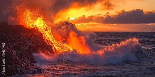 Sunset waves crashing against lava rock create a stunning view. The mesmerizing sunset and dynamic waves add to the beauty of lava rock, showcasing nature s power and elegance.