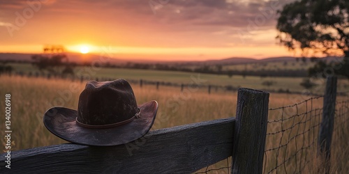 sunset, landscape, rural, cowboy hat, fence, golden hour, countryside, nature, field, outdoors, farm, rustic, tranquil, serene, peaceful, evening, horizon, sky, cloud, sun, light, shadow, photo, image, picture, pastoral, agriculture, scenery, view, beautiful, picturesque, amazing, stunning, breathtaking, inspiring, majestic, magnificent, awesome, incredible, extraordinary, remarkable, superb, marvellously, excellent, great, good, fine, lovely