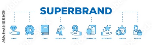 Superbrand infographic icons flow process which consists of luxury, hi-end, story, reputation, quality, guarantee, recognized, limited and loyalty icon live stroke and easy to edit .