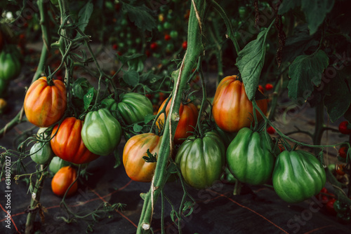 Superfood Tomaten, rote und grüne, reife und unreife Ochsenherz, Fleischtomaten am Strauch.