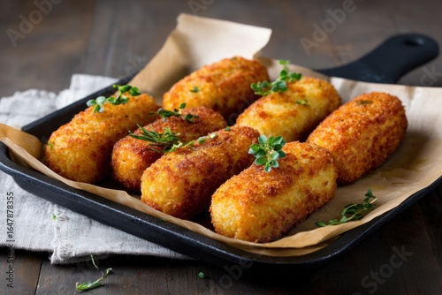 al, italian, food, roman, fried, rice, mozzarella, tomatoes, sauce, meat, starter, finger, crispy, crunchy, gold, hot, warm, cooked, baking, paper, pan, tray, serving, photo, styling, eatery, menu, receipe, culinary, epicure, delicious, tasty, traditional, homemade, comfort, snack, party, catering, buffet, wood, table, dark, background, thyme, rosemary