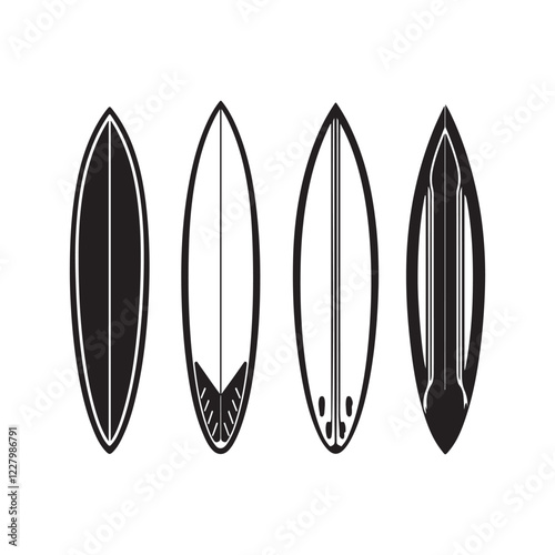 Surfboard silhouettes, surf culture aesthetic, beach lifestyle icon set, classic surfboard styles