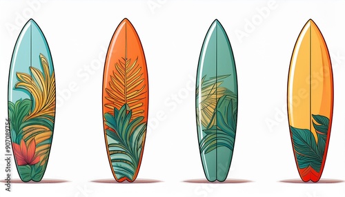Surfboard vector set in tropical design. Surfing board or surfboard clip art. Hello summer concept. Summer element. Cartoon flat vector isolated on white background.